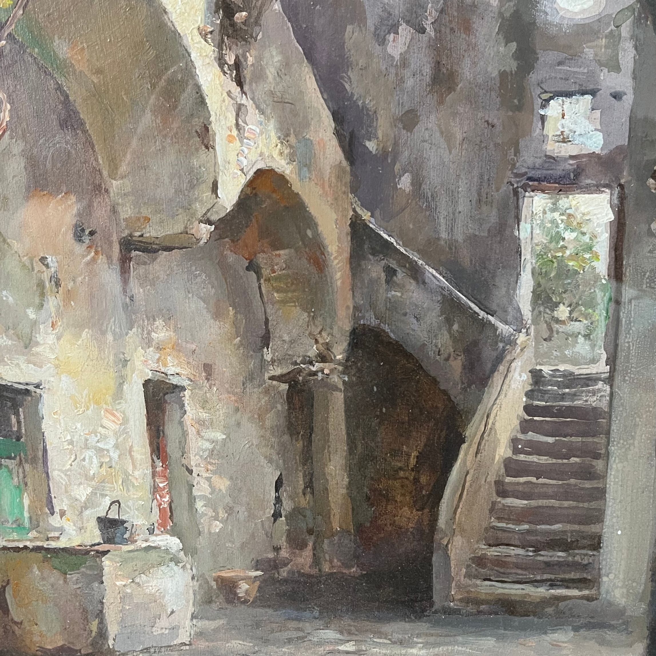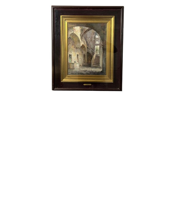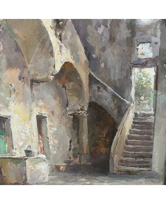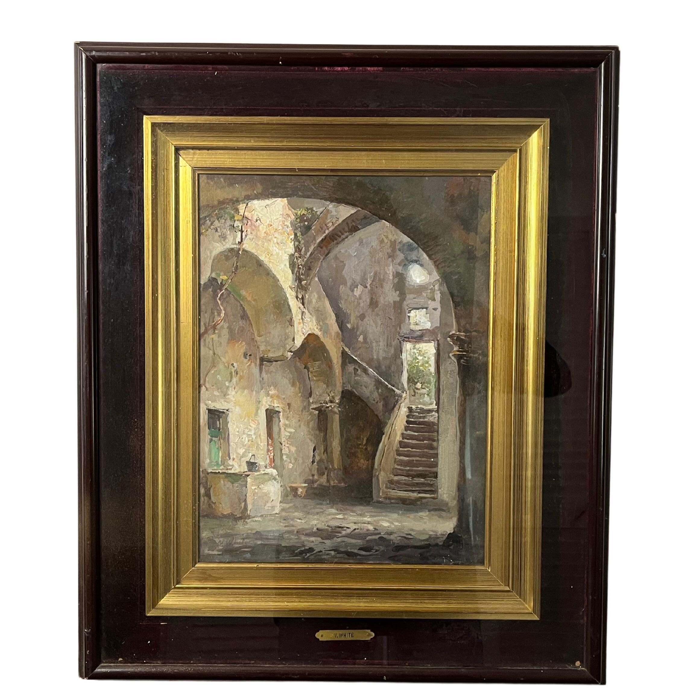 Oil painting on panel, 20th century period, depicting an interior courtyard. Inside frame dimensions: 30x40 cm Signed in the bottom left by V. White.