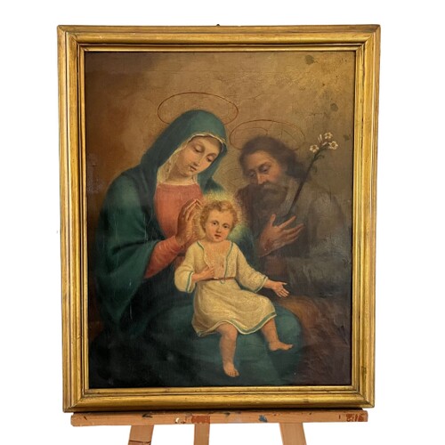 The painting, endowed with a classical composition, visually centers on the figure of Jesus, who appears to radiate his own luminosity and represents the true focal point of the composition. The light of the child's Glory illuminates the face of Mary, created with a blend of sweetness and concern for the future of her Son. Joseph, placed in the background, is depicted in a position of mystical contemplation and appears slightly less illuminated, emphasizing his role as the foster father. The painting is extremely pleasing and elegant in form and color combination. Period: 19th century Origin: Private collection in Naples Technique: Oil on canvas Dimensions: With frame: 59x72 cm; without frame: 50x62 cm Condition: The painting is in excellent condition.