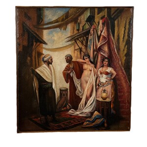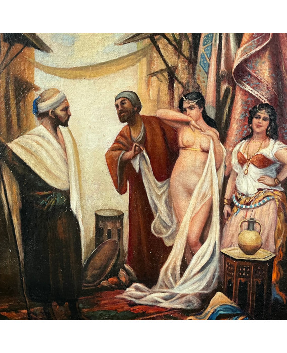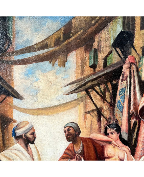 Oil painting on canvas, 19th/20th-century period, by an anonymous artist of the Italian School, depicting The Slave Trader. Relined in the 20th century, with small signs of wear. Dimensions: 56x62 cm. Anonymous artist