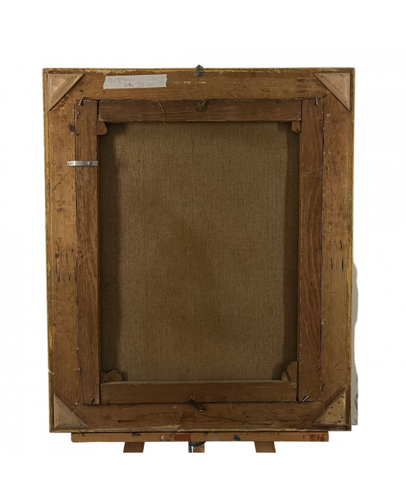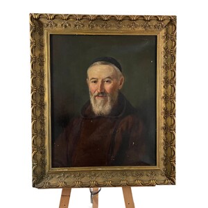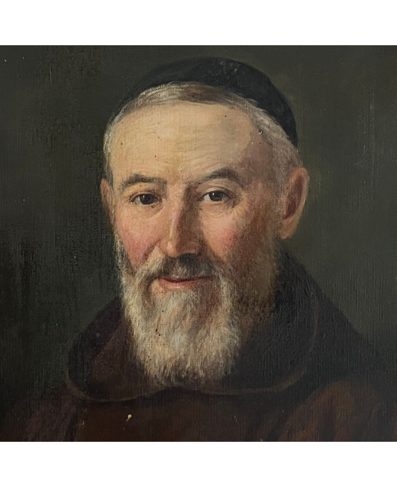 Il frate cappuccino con in capo una berretta scura, rivolge allo spettatore uno sguardo intenso e divertito. I particolari con cui è stato raffigurato fanno pensare ad un ritratto di accademia. Dipinto gradevole sia nella fattura che nelle dimensioni e anche per la presenza di cornice coeva. Epoca: Fine XIX secolo Provenienza: collezione privata Napoli Tecnica: olio su tela Dimensioni: Con cornice cm 65x78; senza cornice: 51x63 cm Condizioni: il dipinto si presenta in buono stato di conservazione: sono visibili piccole cadute di colore e piccole mancanze nella cornice