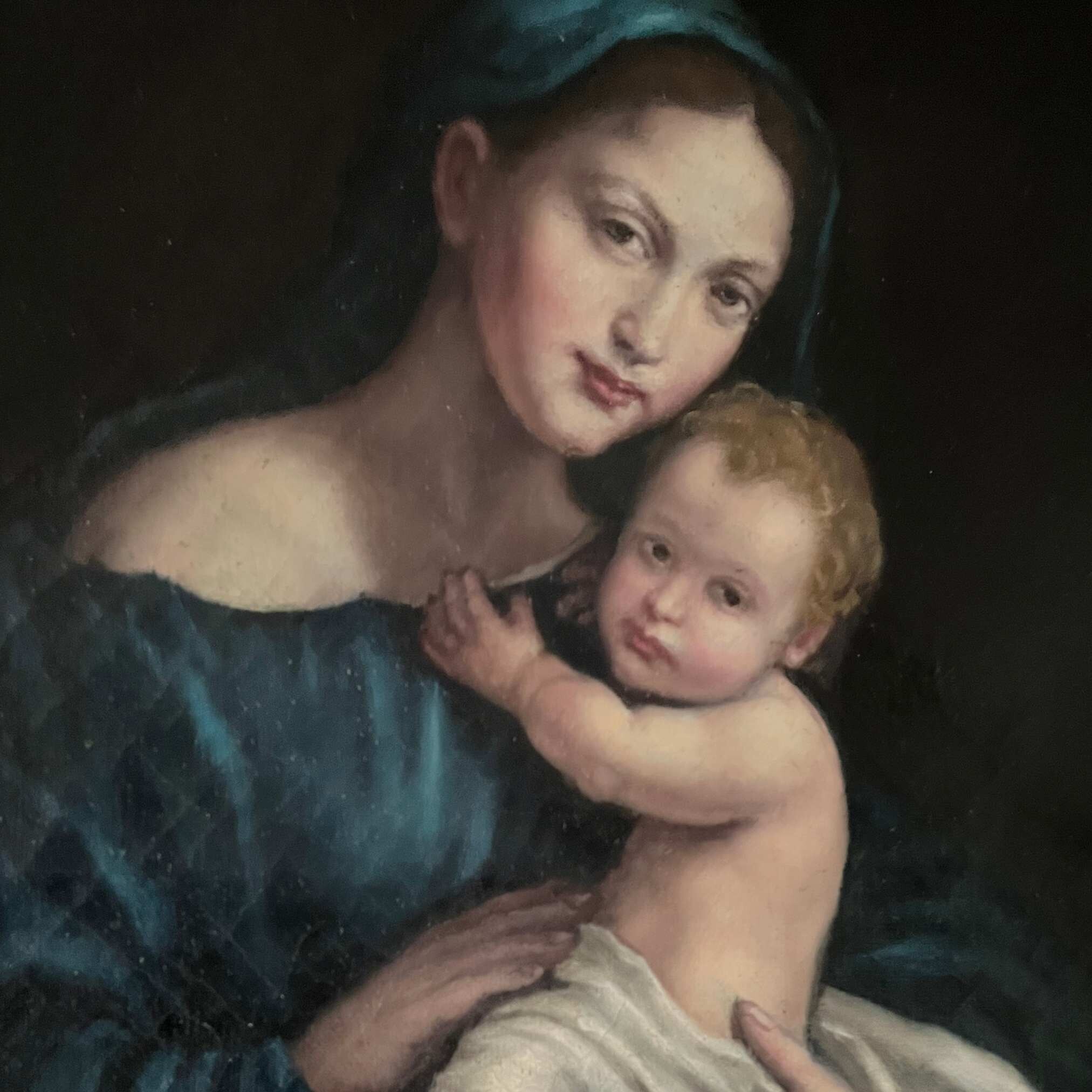 Dipinto olio su tela, Scuola Francese XIX/XX secolo, raffigurante Madonna col Bambino. (Rintelo) Dimensioni: 63x75 cm compreso cornice (difetti e mancanze).